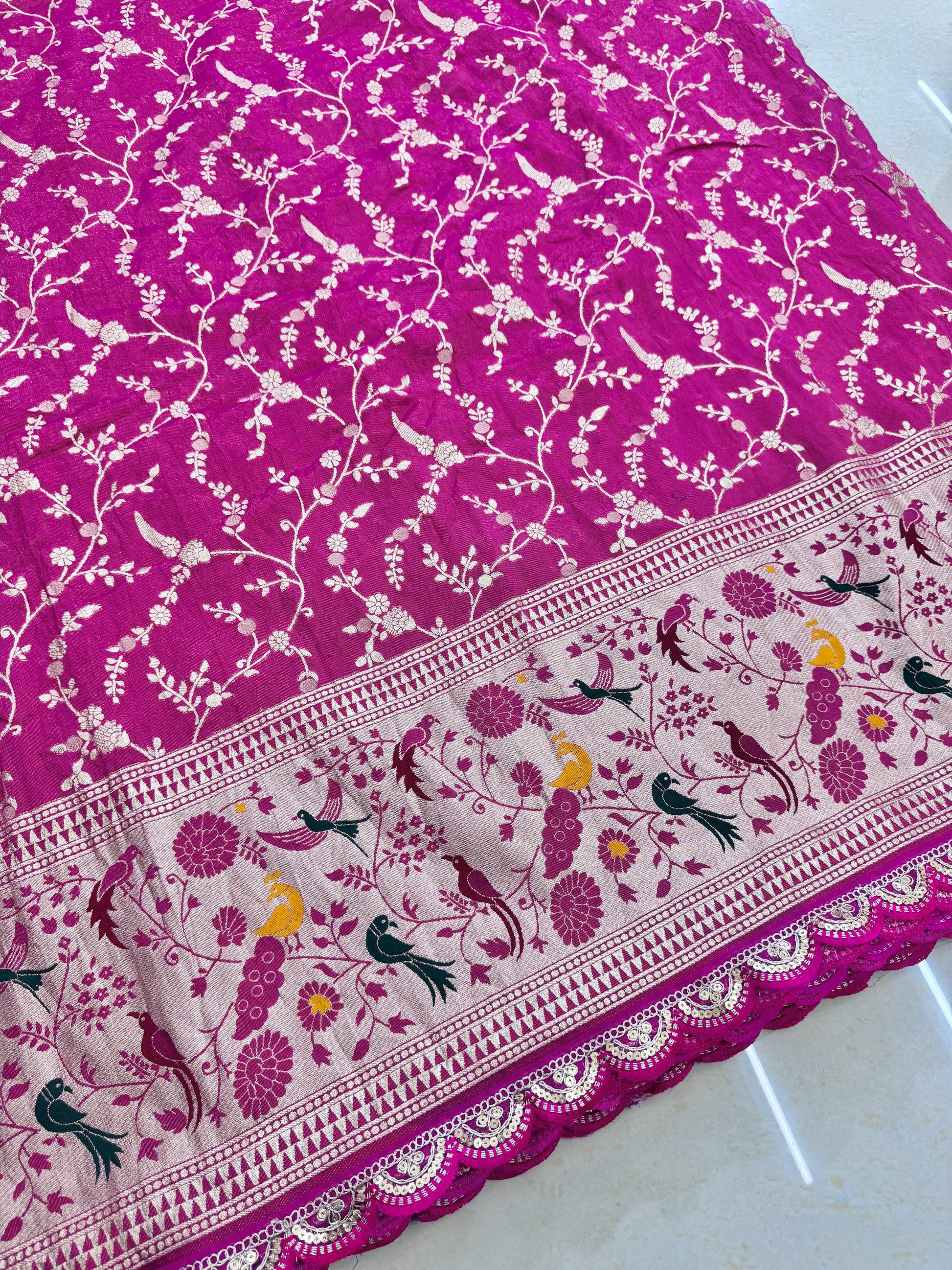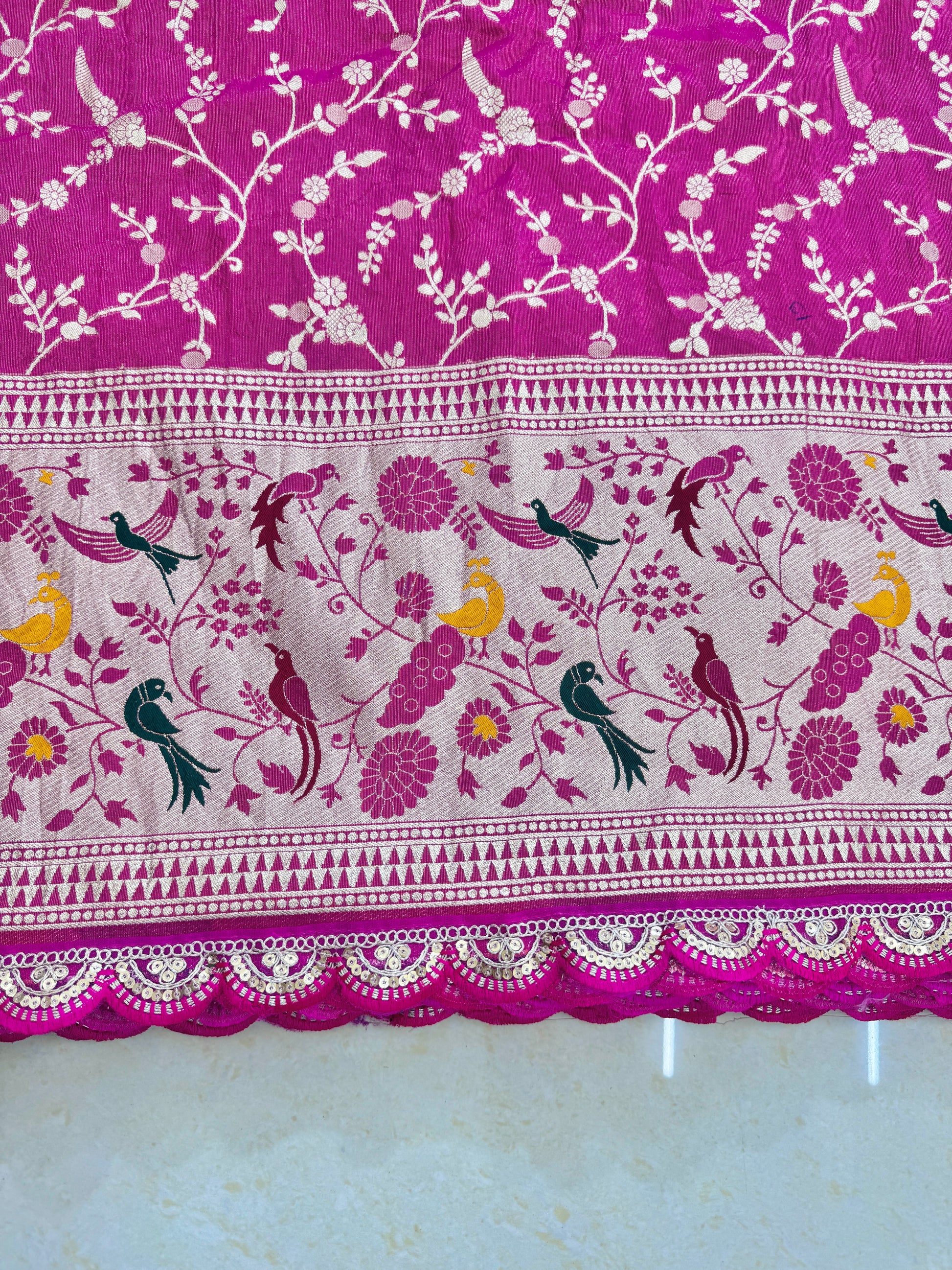 This fabric features a rich magenta pink base beautifully adorned with elegant white floral vines all over. The border is designed with intricate bird and floral weaving in mustard yellow, dark green, and wine tones, giving it a luxurious and traditional appeal. The scalloped lace edge with silver highlights adds extra grace and finishing. (PRODUCT CODE ABS0023)