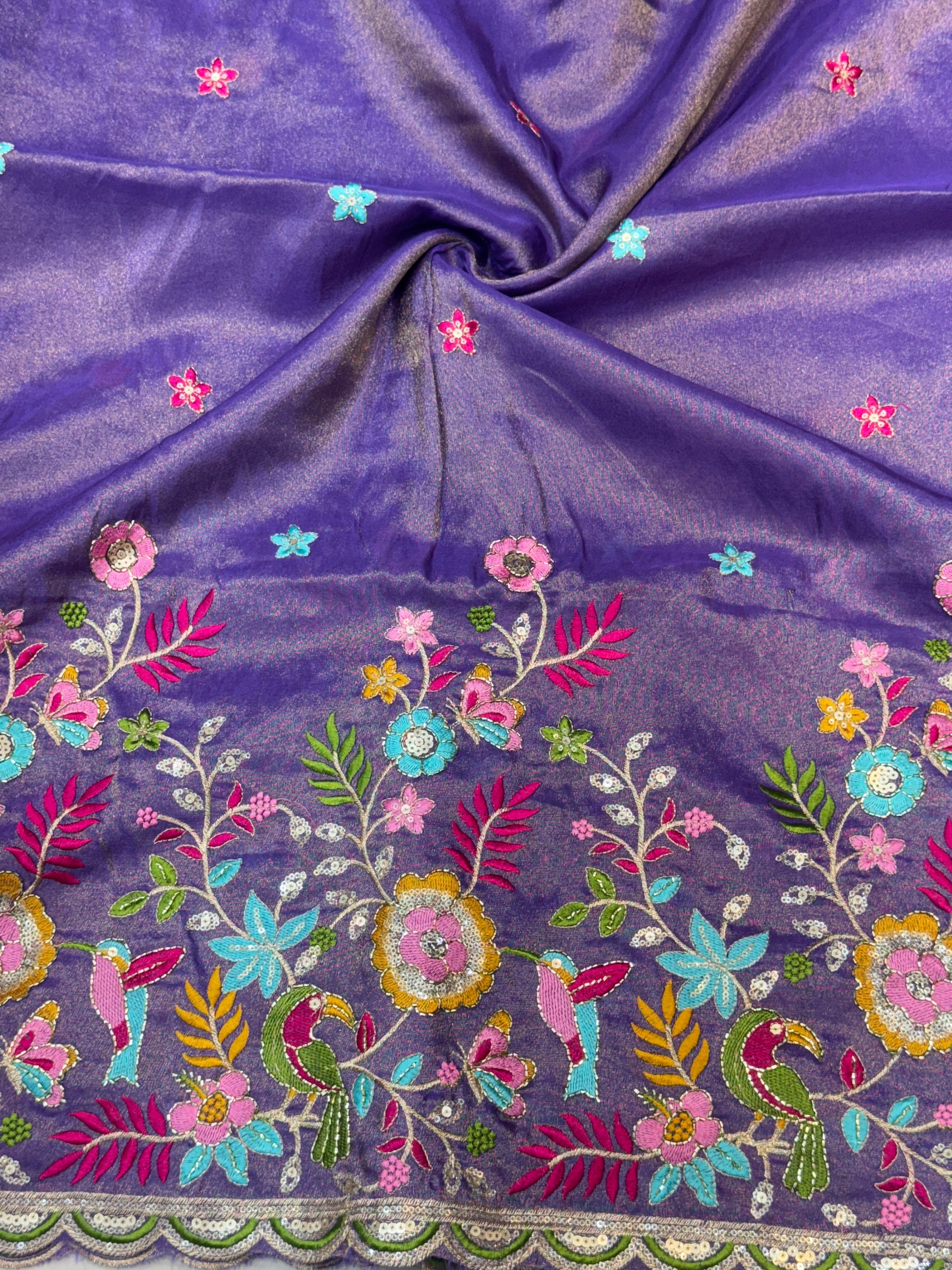 Bring elegance and vibrance to your creations with this luxurious violet silk blend fabric, adorned with exquisite multi-colored floral embroidery and bird motifs. The intricate detailing in shades of pink, turquoise, green, yellow, and silver sequins adds a touch of sophistication and festive charm, making it perfect for statement outfits.