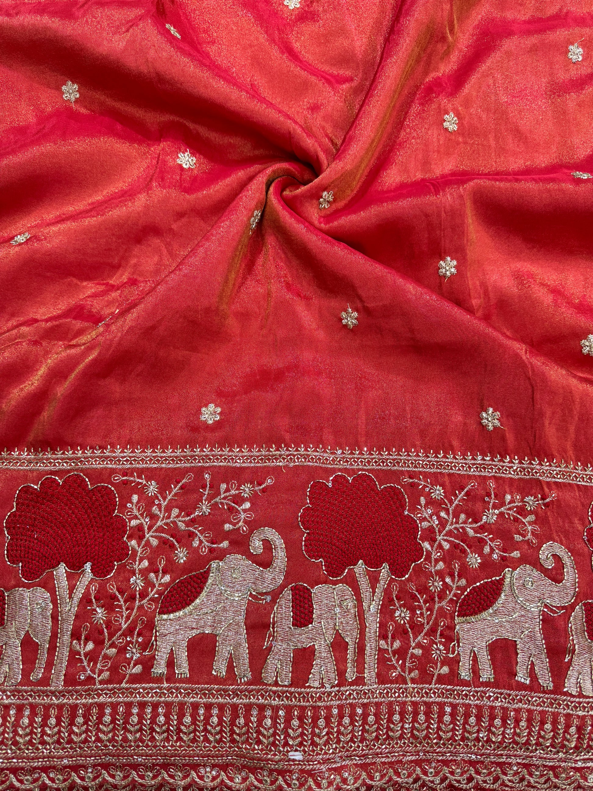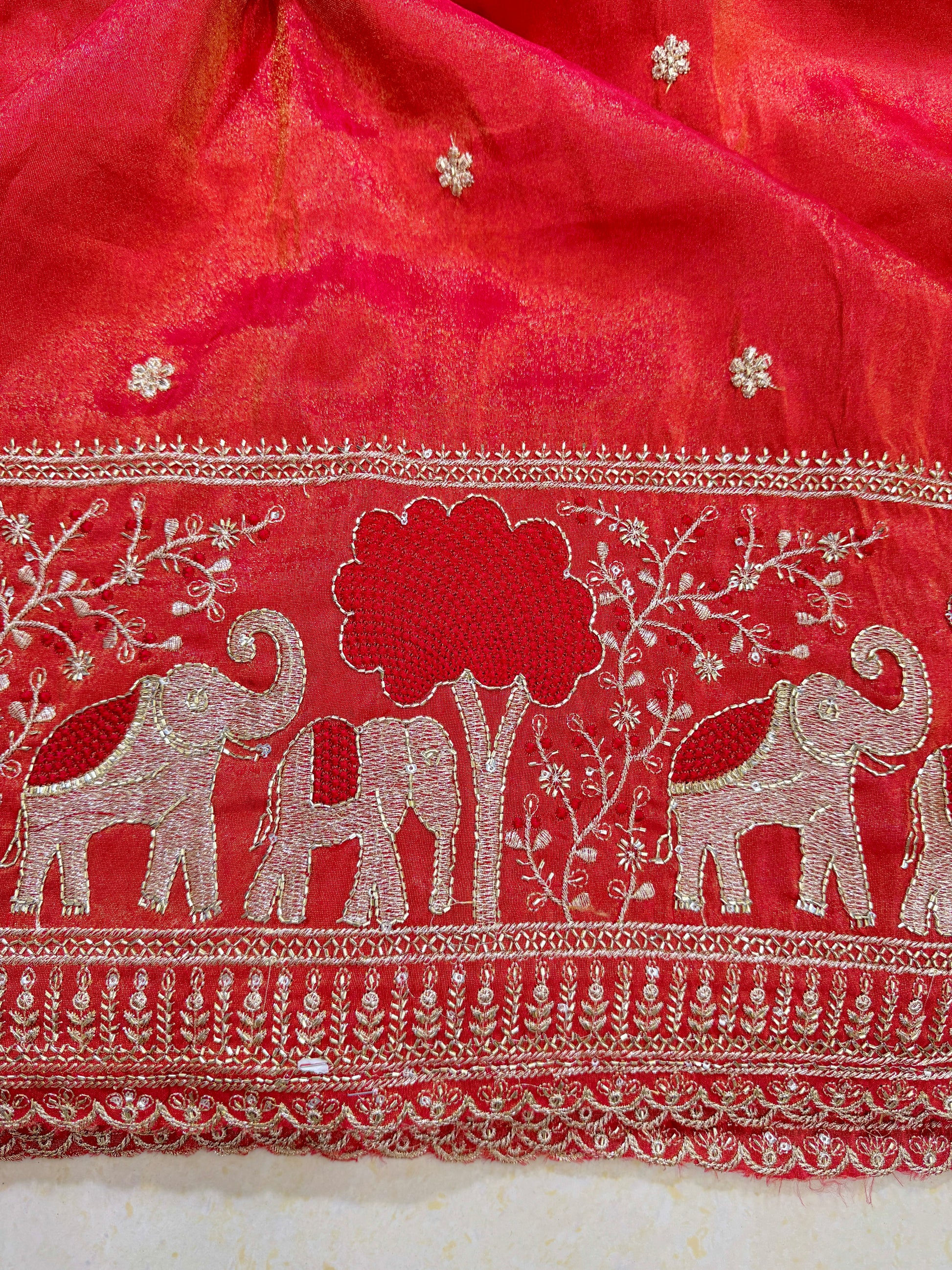 Step into timeless elegance with this luxurious royal tissu fabric, adorned with exquisite golden zari weaving. The fabric showcases a rich design with traditional elephant and tree motifs on the border, symbolizing grandeur and heritage. The body is embellished with delicate golden floral buttas, adding a graceful charm to the overall look.