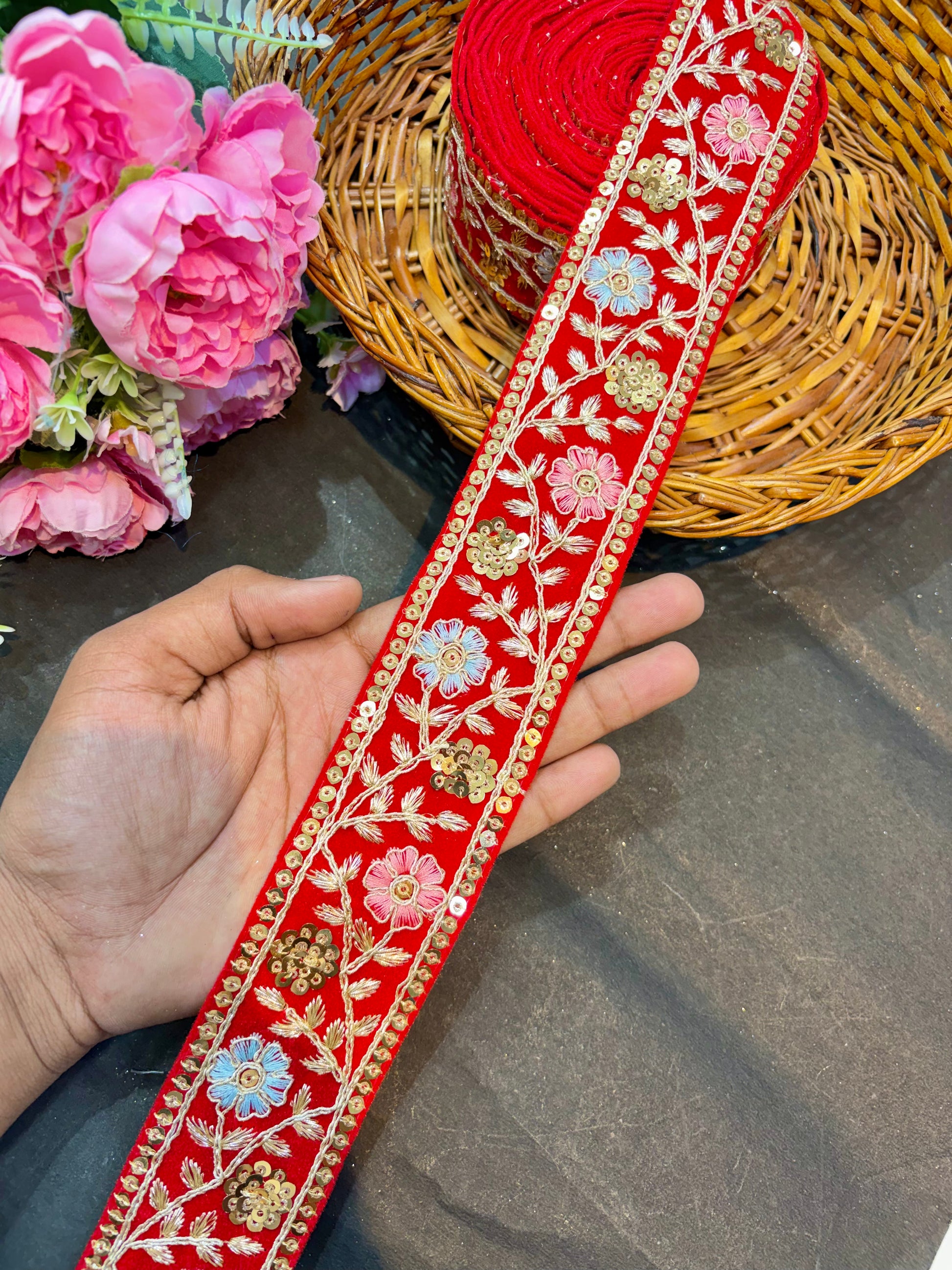 Velvet Embroidered Lace Trim | Saree Border | Craft Velvet Fabric Lace (9 Mtr)black 2inchred