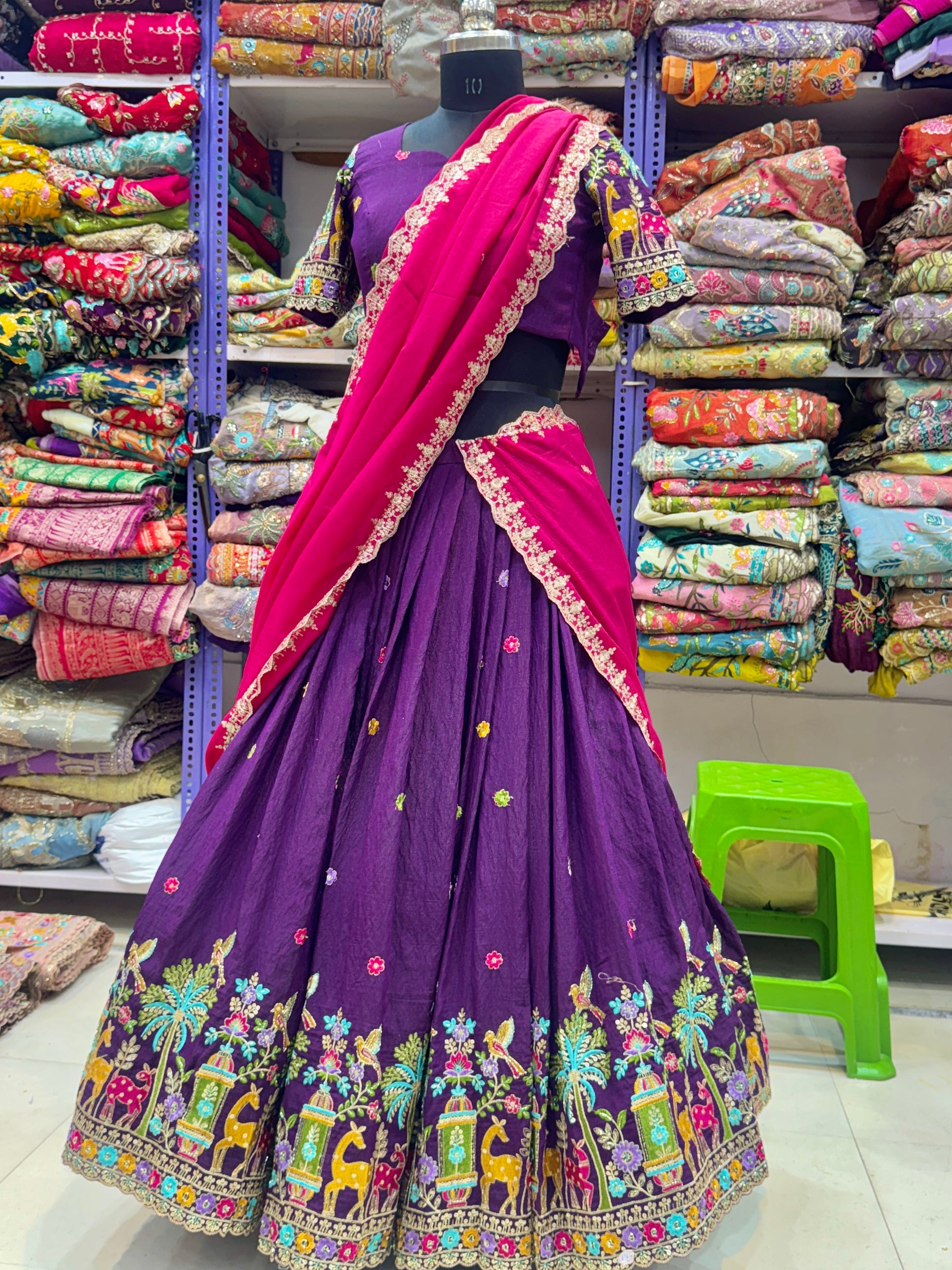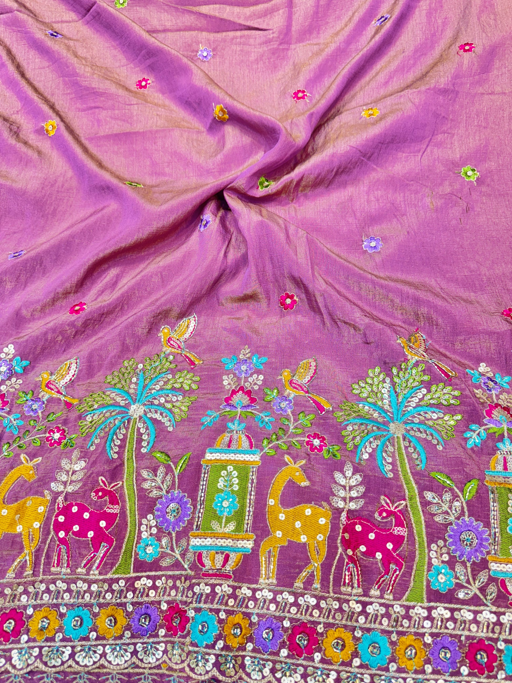 Elevate your style with this exquisite Purple Silk Blend Fabric, beautifully adorned with intricate multicolor thread and sequin embroidery. The fabric features a vibrant design of graceful deer, blooming florals, elegant trees, and perched birds, creating a mesmerizing tapestry of nature. Delicate scattered floral motifs add charm across the body, while the border showcases heavy embroidery that enhances its luxurious appeal.