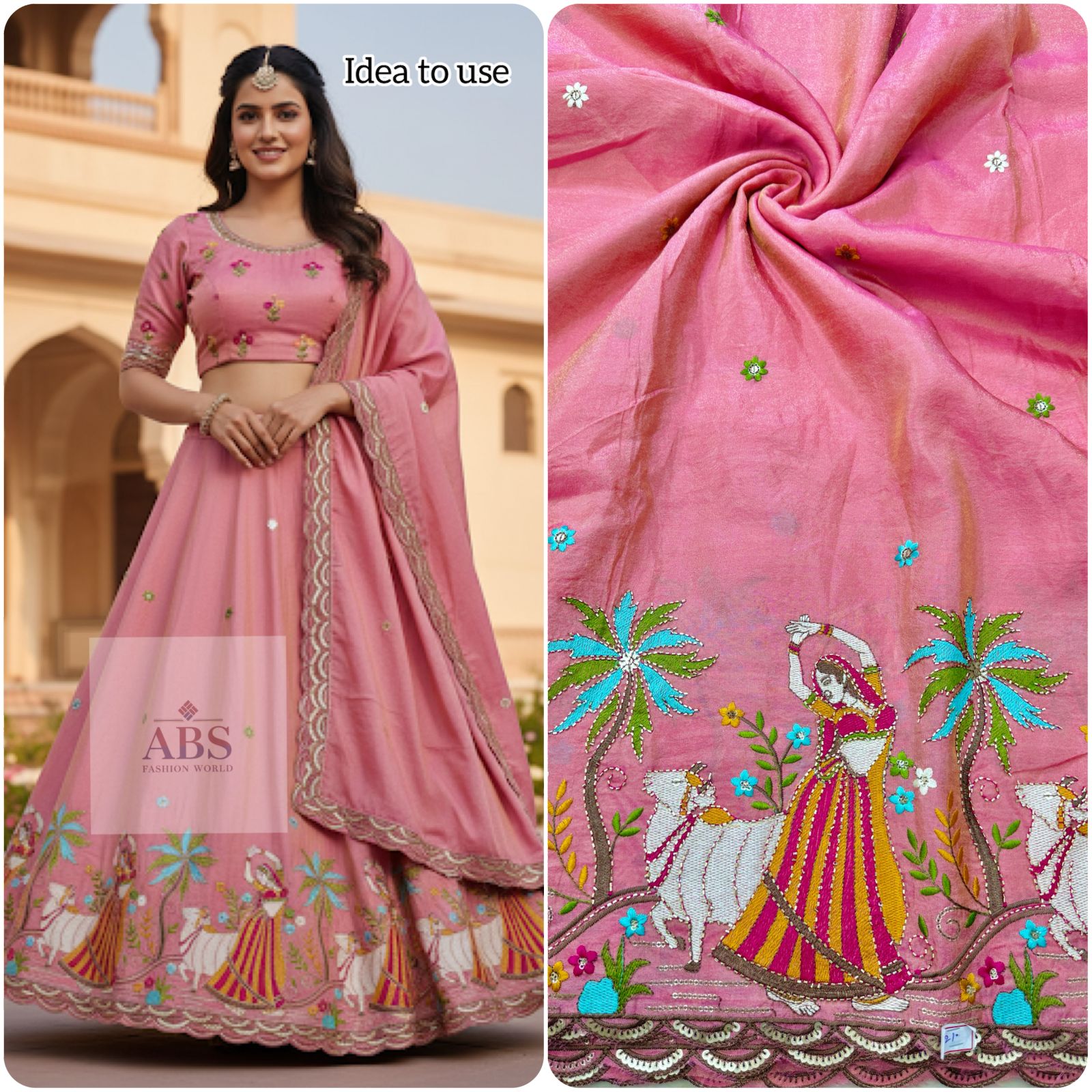 Crafted on a soft, lightweight fabric base, this material is perfect for designing lehenga cholis, saree blouses, dupattas, kurtis, festive gowns, and decorative home textiles. The fine embroidery, highlighted with zari-style threads and colorful accents, makes it ideal for wedding wear, festive outfits, and cultural performances.