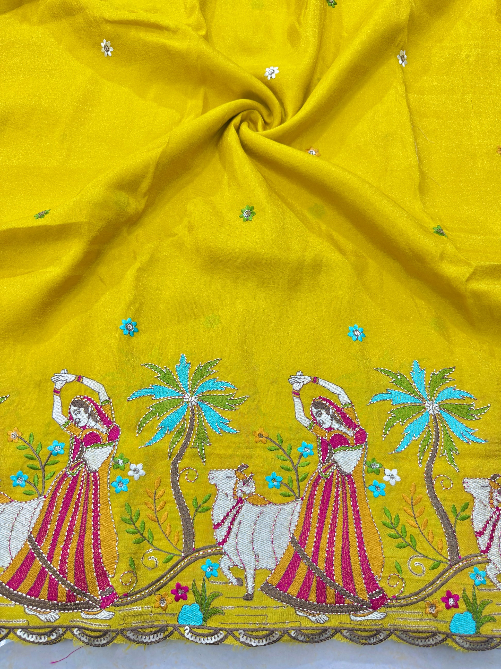 Viscose Tissue Embroidered Fabric – Dancing Lady & Cow Motif (44” Width) YELLOW