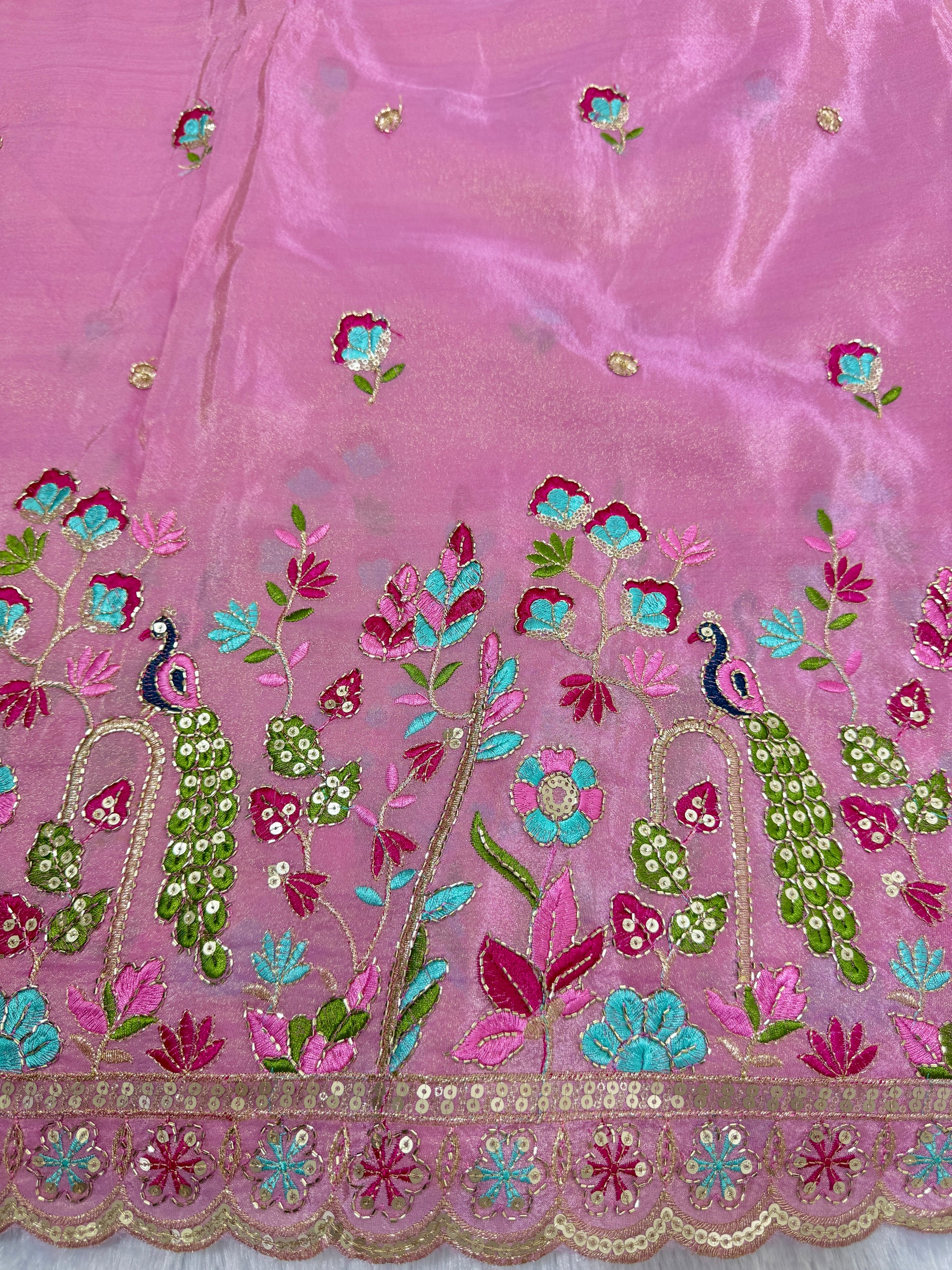 Viscouse tissue multi embroidery 🦚peacock Desing border 🌸44inch width baby pink