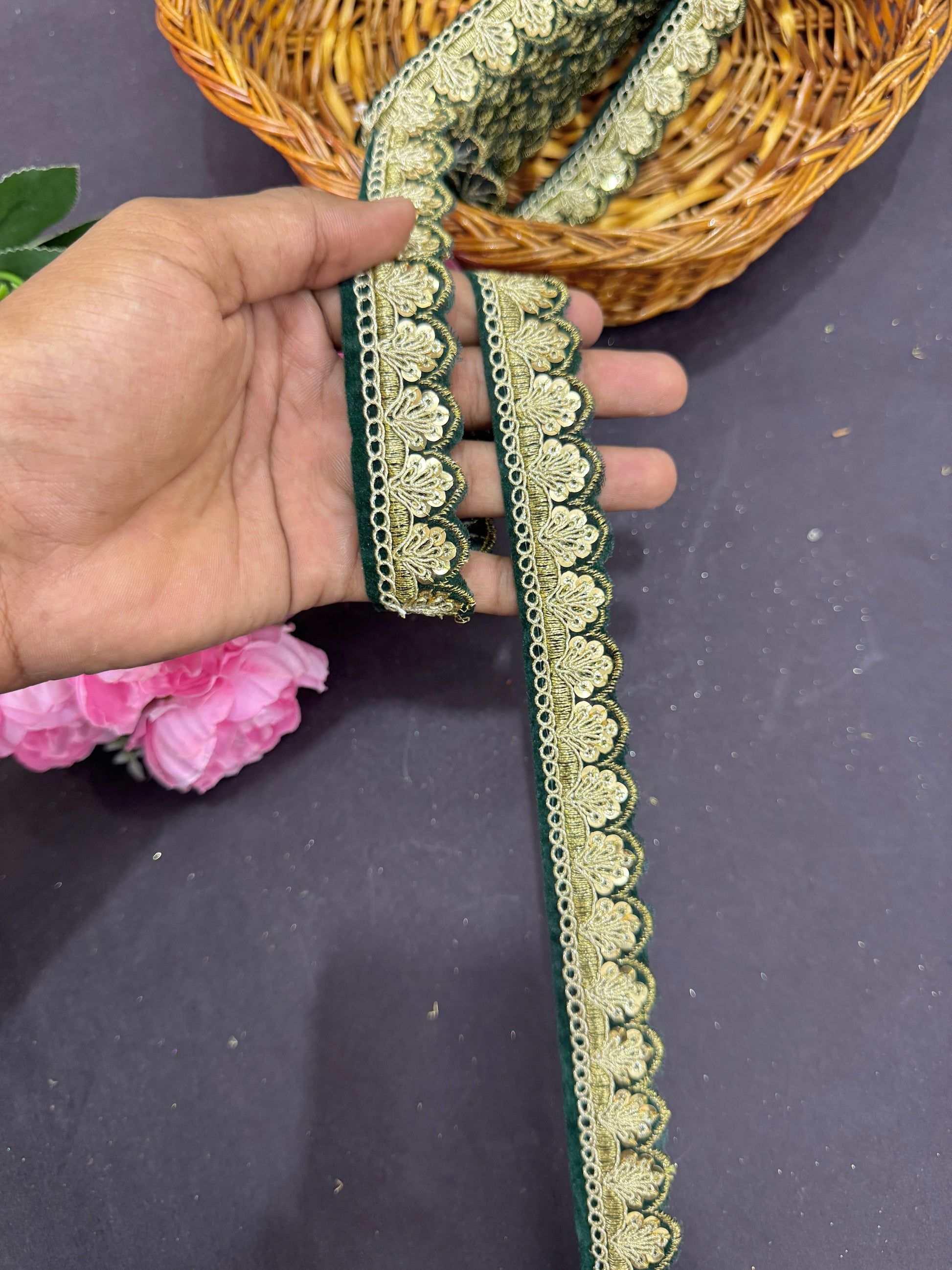 Zari Sequins Velvet Embroidered Cut Work Lace Sare Lace Pack of 9 Metr Dark Green